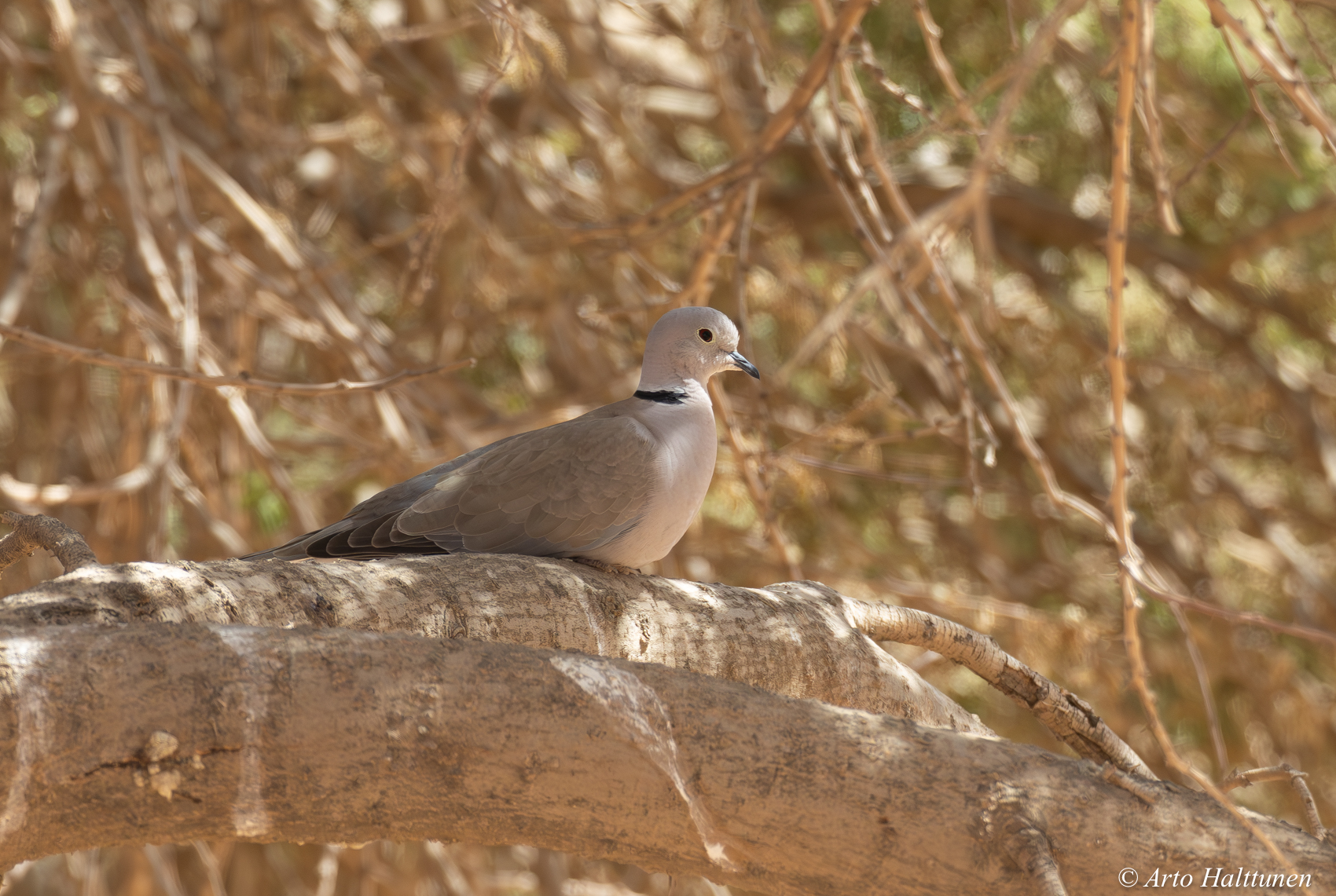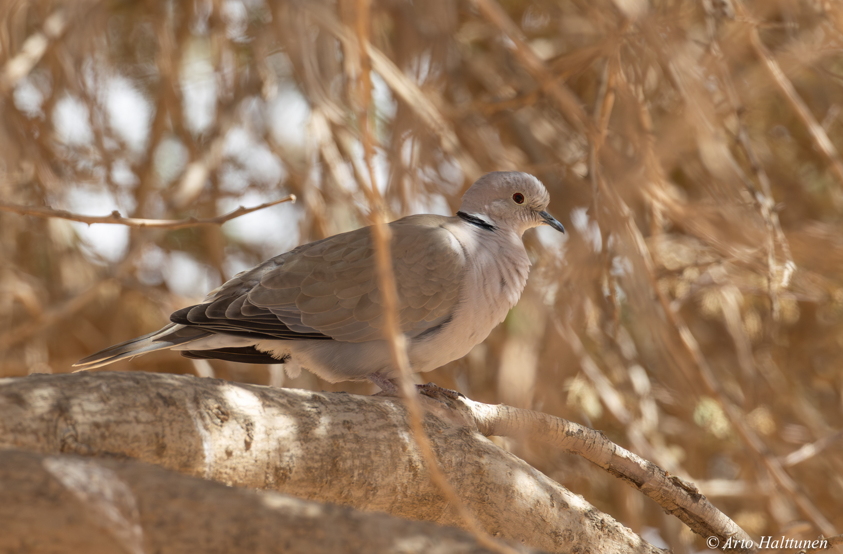 Saharanturturikyyhky/turkinkyyhky. Pyrstön alapeitinhöyhenissä hieman harmaata sävyä joka viittaa siihen, että turkkilainen on joskus käynyt kylässä. Muuten kaikki sopii hyvin saharanturreen. Myös laulu sopi hyvin ja sen perusteella lintu löytyi. Pinnaa tuosta ei saa jos ei sitä ota :)
