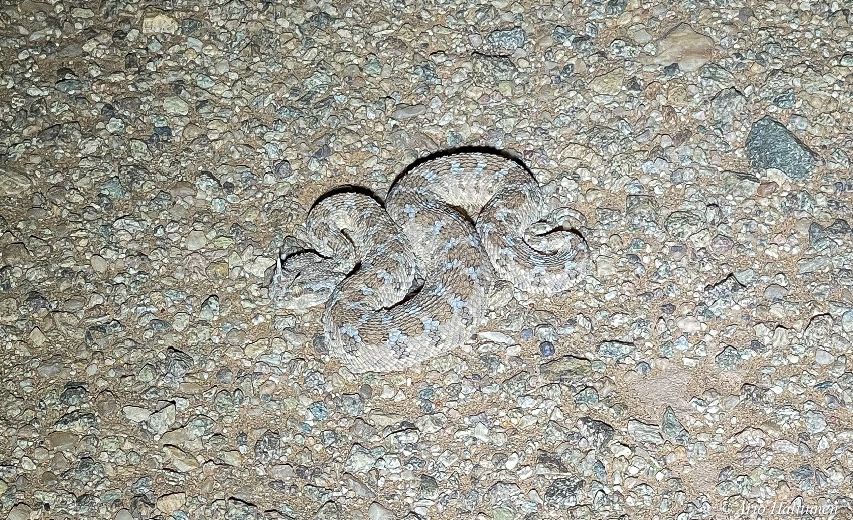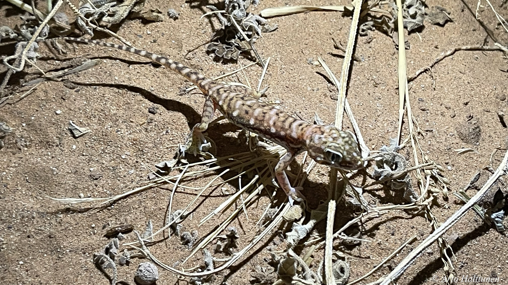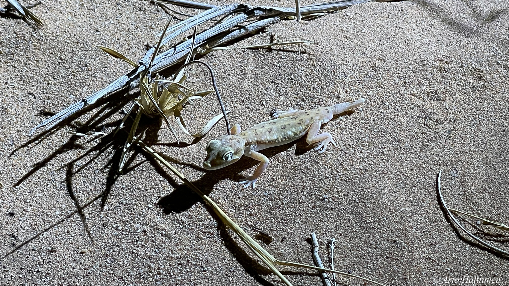 Muutama kännykällä otettu kuva yöllä taskulampun valossa nähdyistä aavikon asukeista