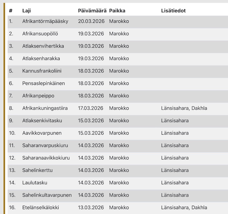 Lajeja nähtiin Länsisaharassa ja Marokossa yhteensä 166 + victoriankaijanen.